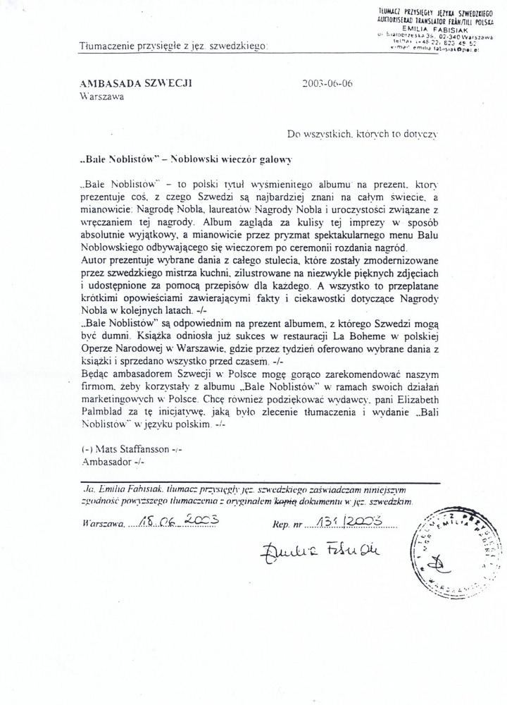 „Bale Noblistów” – Noblowski wieczór galowy – List ambasadora Szwecji w Warszawie (tłumaczenie polskie)